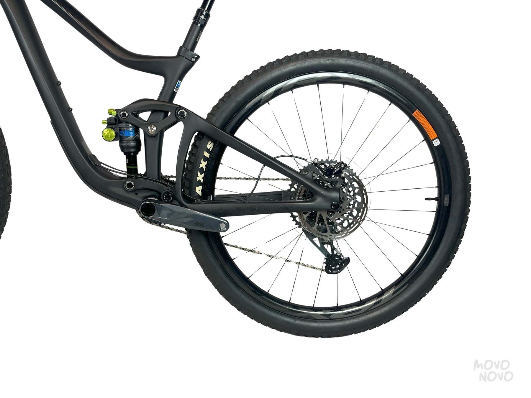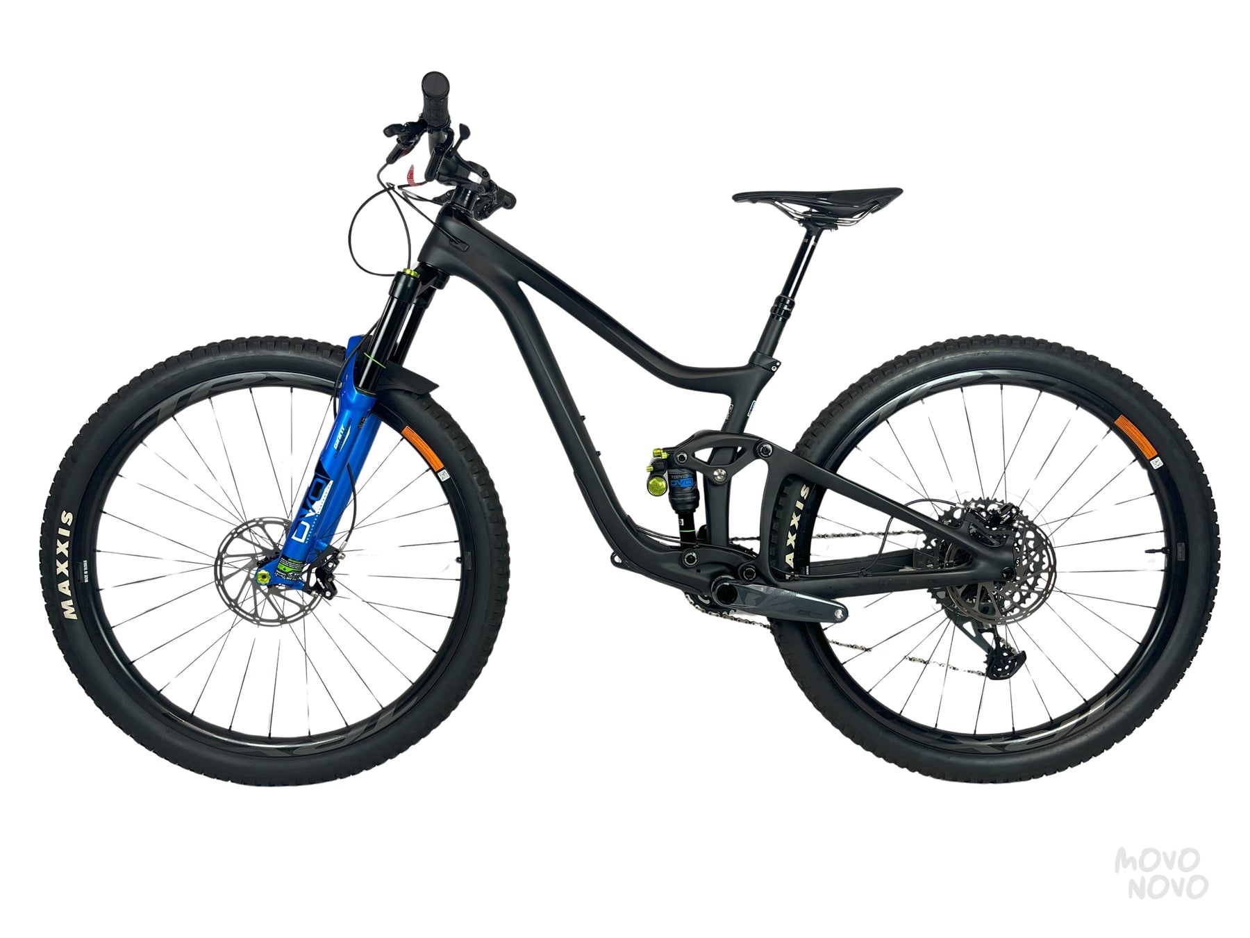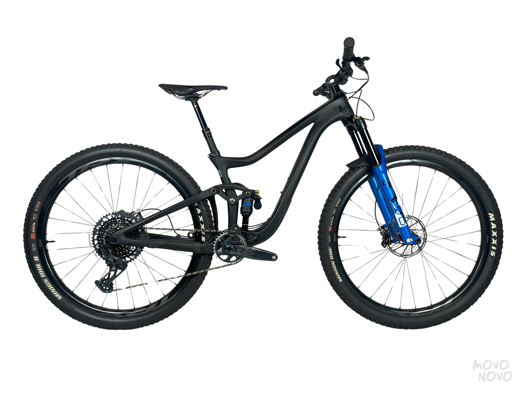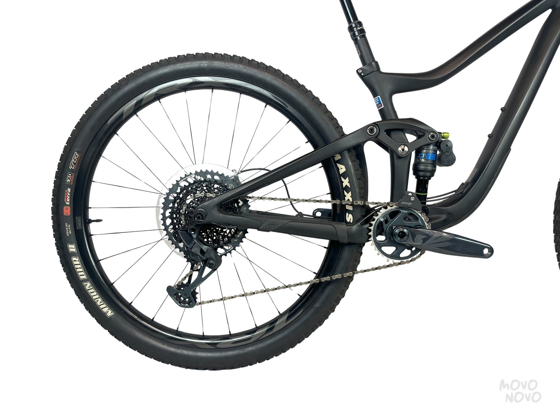 La bicicleta está equipada con una transmisión SRAM Gx 1x12, frenos SRAM Guide RSC, suspension DVO Sapphire, shock DVO Topaz2 y rines TRX de carbono