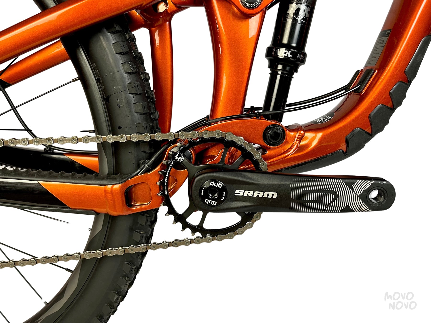 Una bicicleta de enduro talla S2. El cuadro es de aluminio. Pesa 14 kg. Tiene componentes Sram SX. Después de una detallada revisión, su calificación es de 8.97.