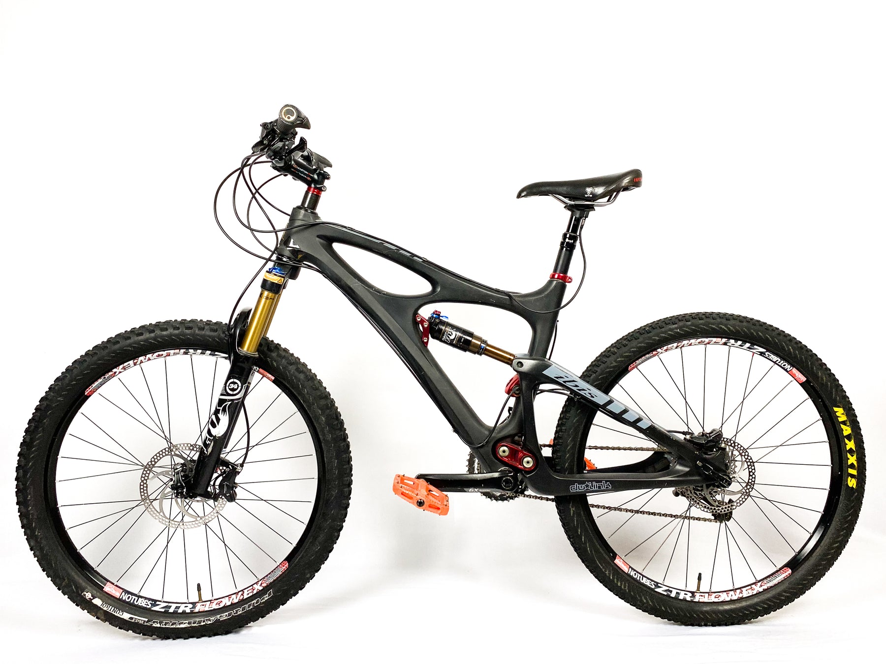 Una bicicleta de enduro talla M. El cuadro es de carbón. Tiene componentes Sram X9. Después de una detallada revisión, su calificación es de 8.5.