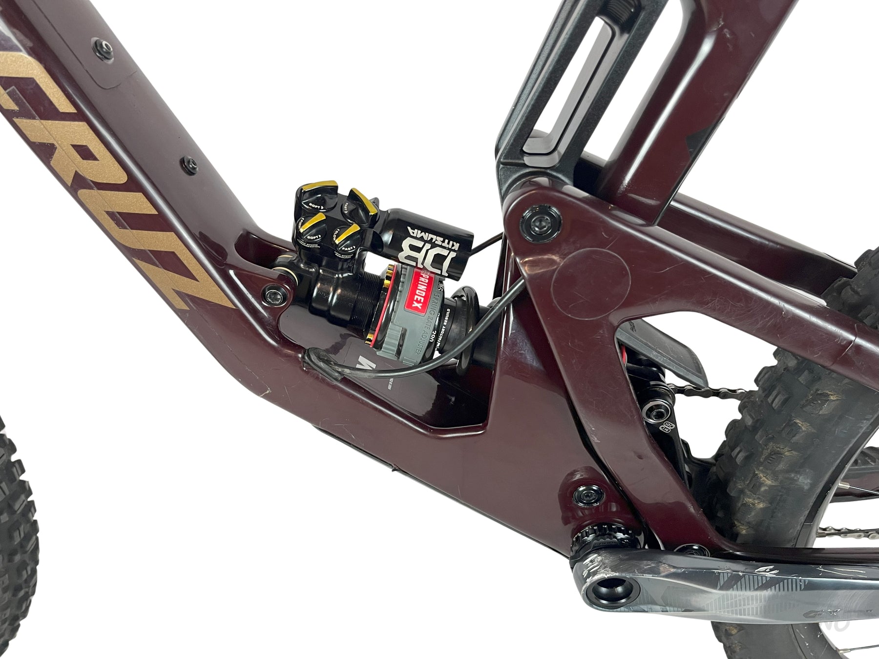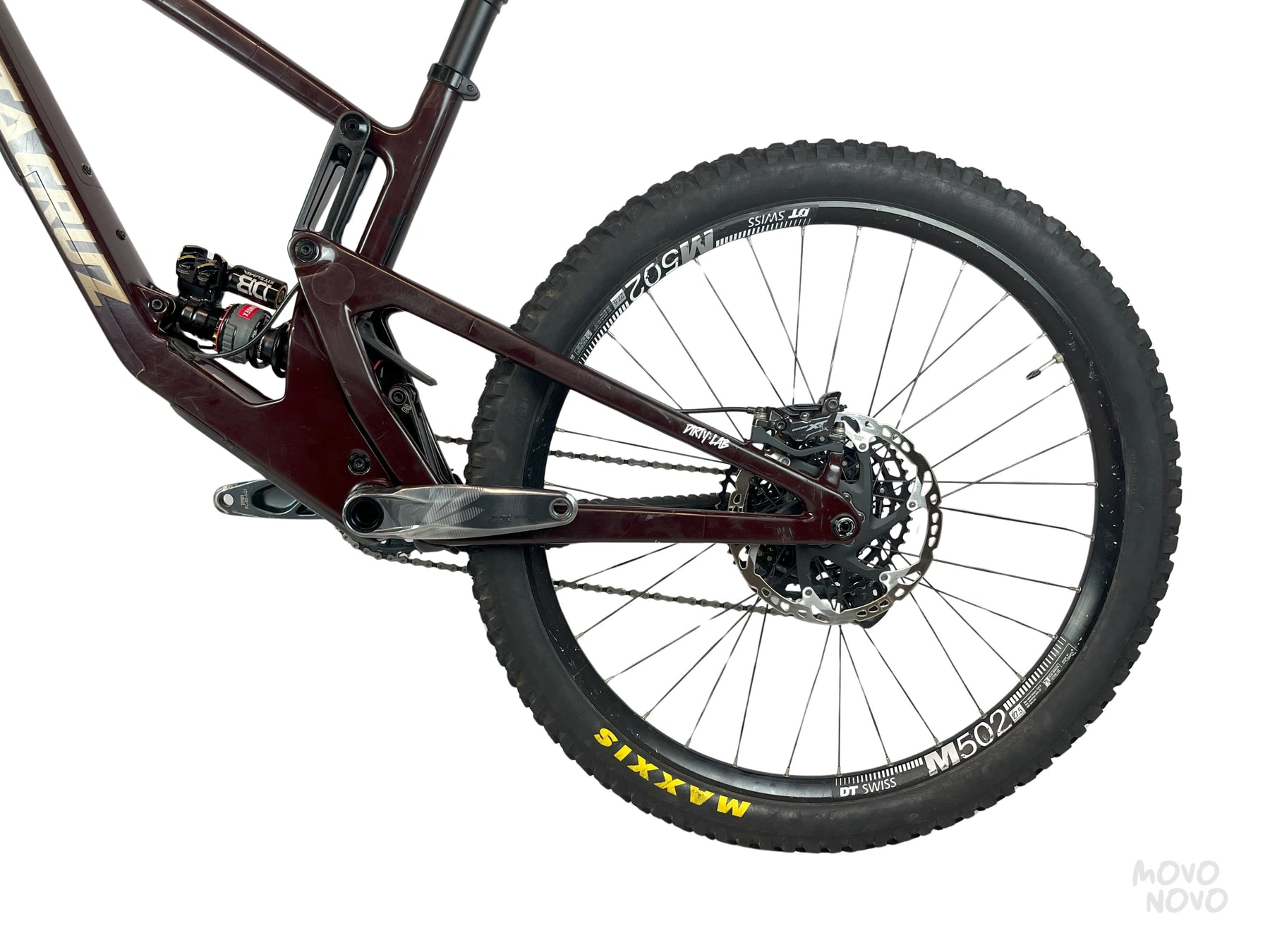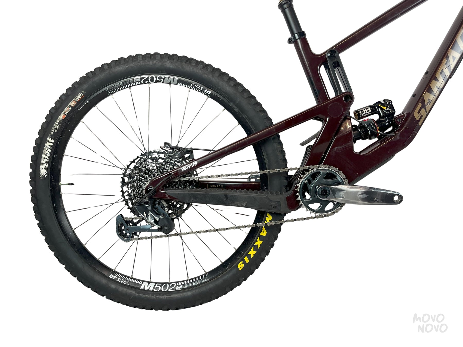 La bicicleta esta equipada con una transmisión SRAM GX 1x12, frenos Shimano XT de generaciones diferentes, suspensiones Fox 38 Kashima y Shock DB Kitsuma