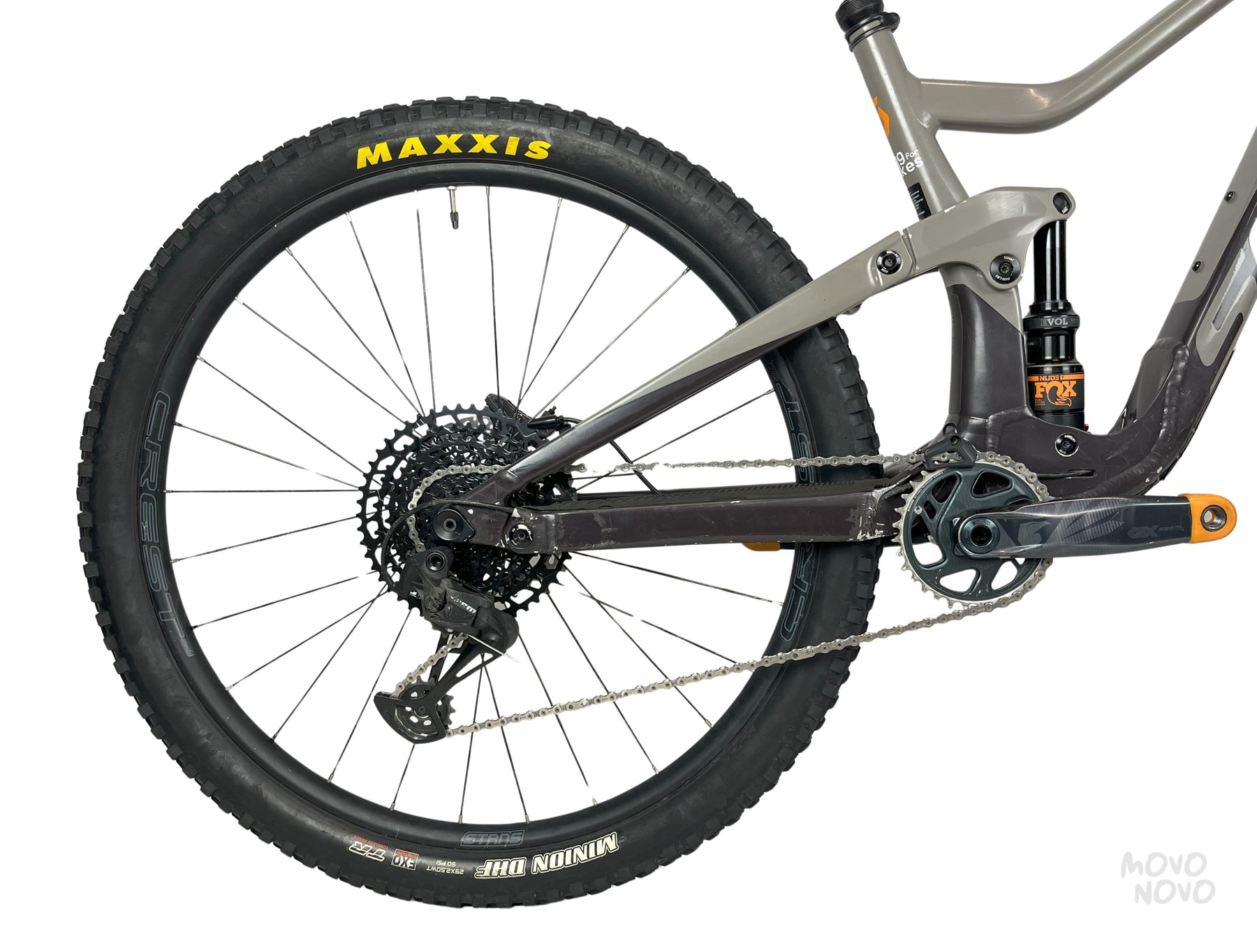 La bicicleta está equipada con SRAM SX en cassette y desviador y bielas GX, frenos Shimano MT520 y suspensiones Fox 36 y Shock Fox NudeT