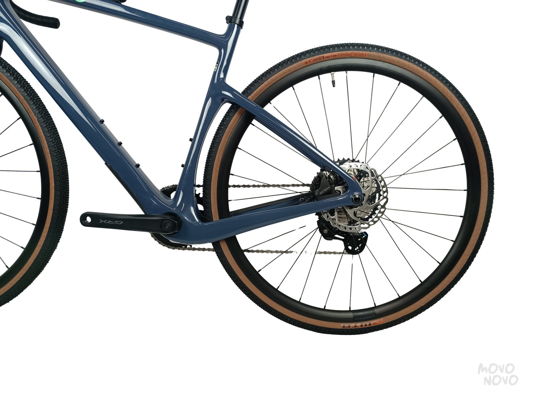 La bicicleta está equipada con una transmisión Shimano GRX y aros de aluminio Alex Rims.