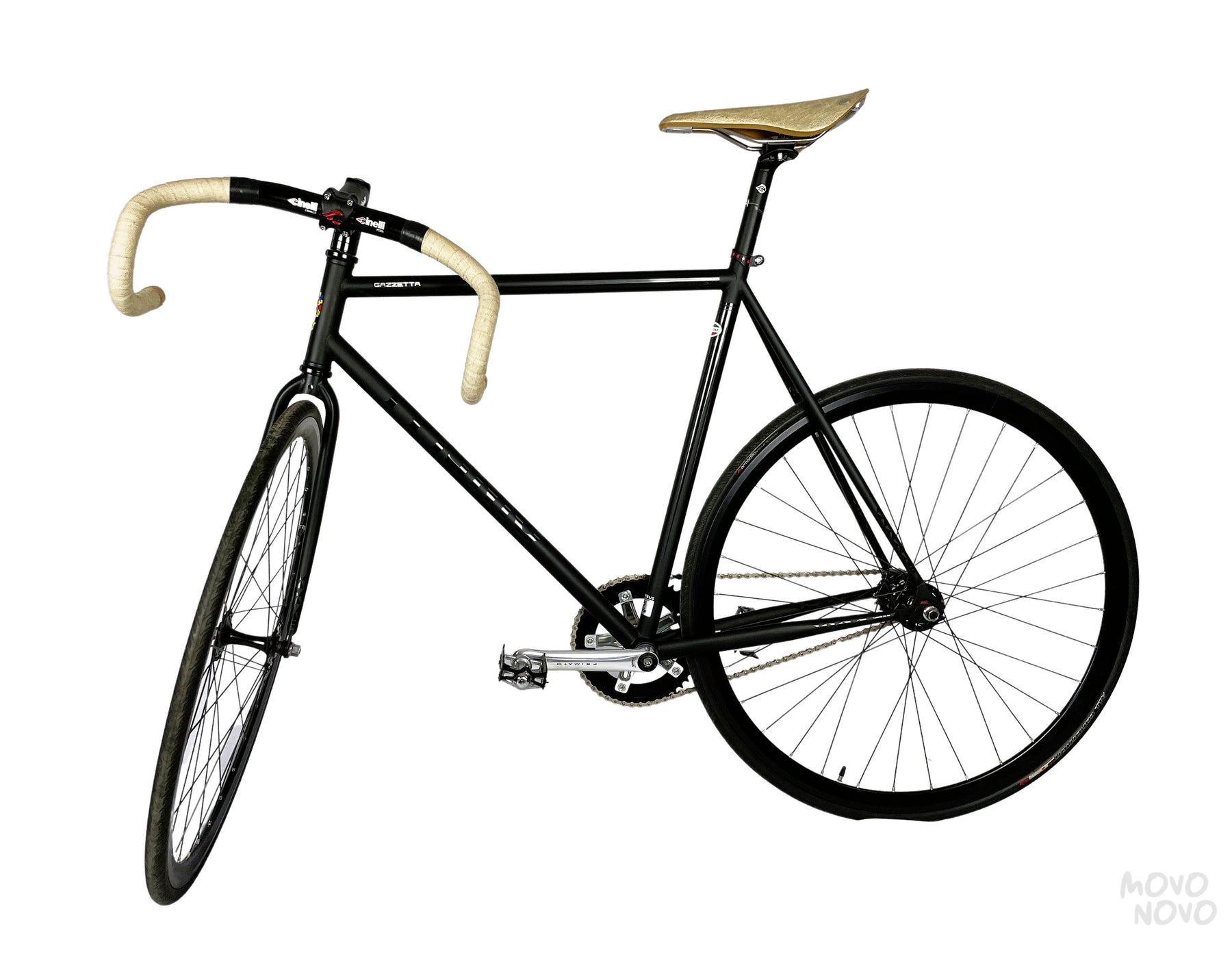 Tiene 1 velocidad, componentes Miche, tiene asiento y cinta de manubrio marca Brooks. Es una bici que se usaba para time-trial. No cuenta con free-hub entonces se frena con los pedales.