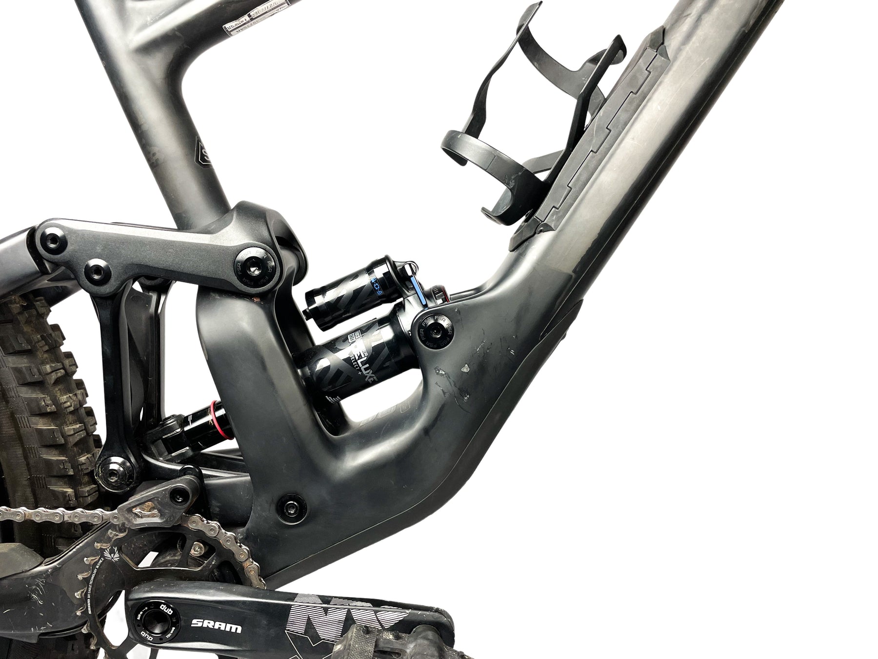 Una bicicleta de enduro talla M,L. El cuadro es de carbón. Tiene componentes SRAM NX y Frenos SRAM Code. Después de una detallada revisión, su calificación es de 9.82.