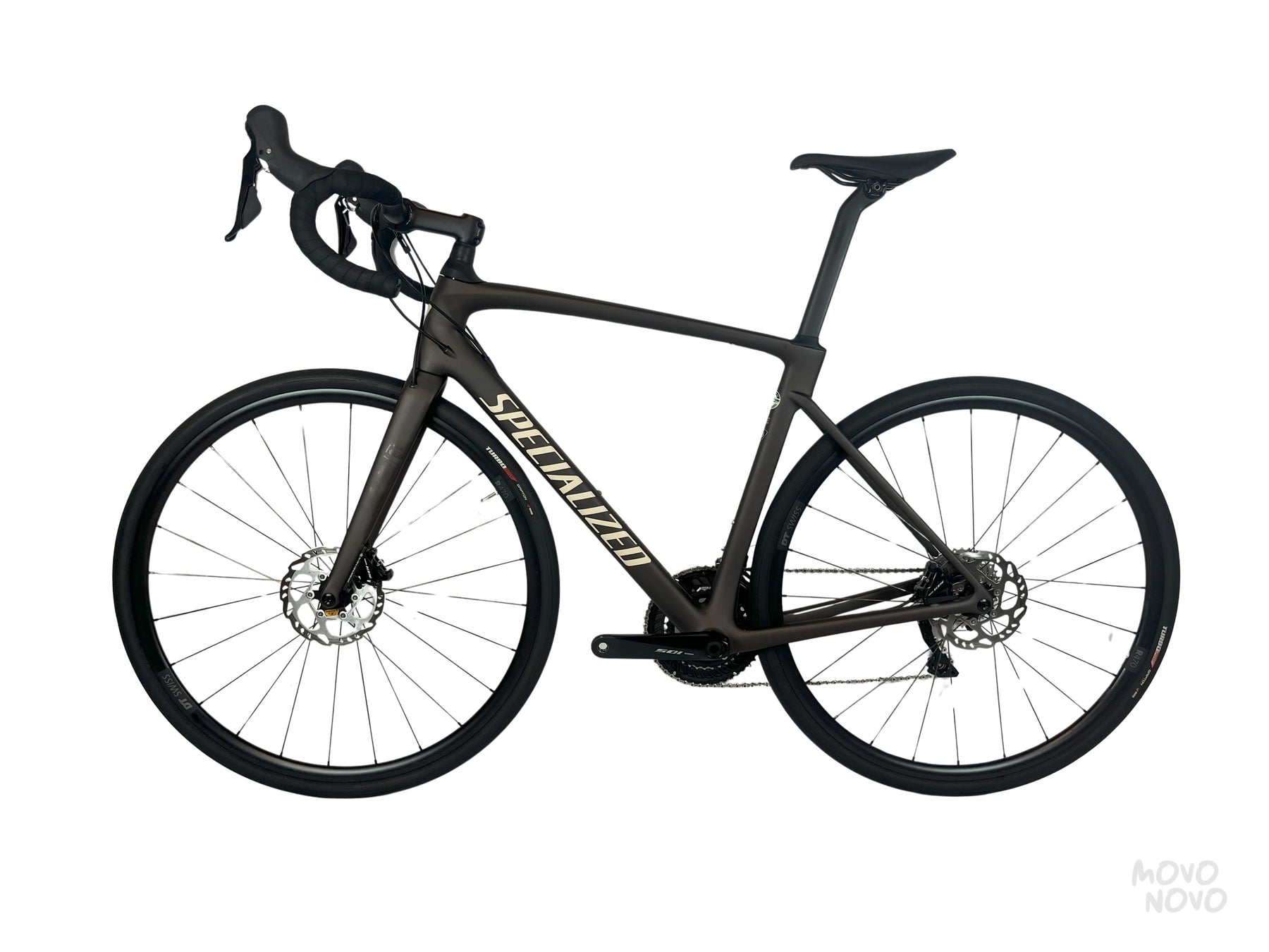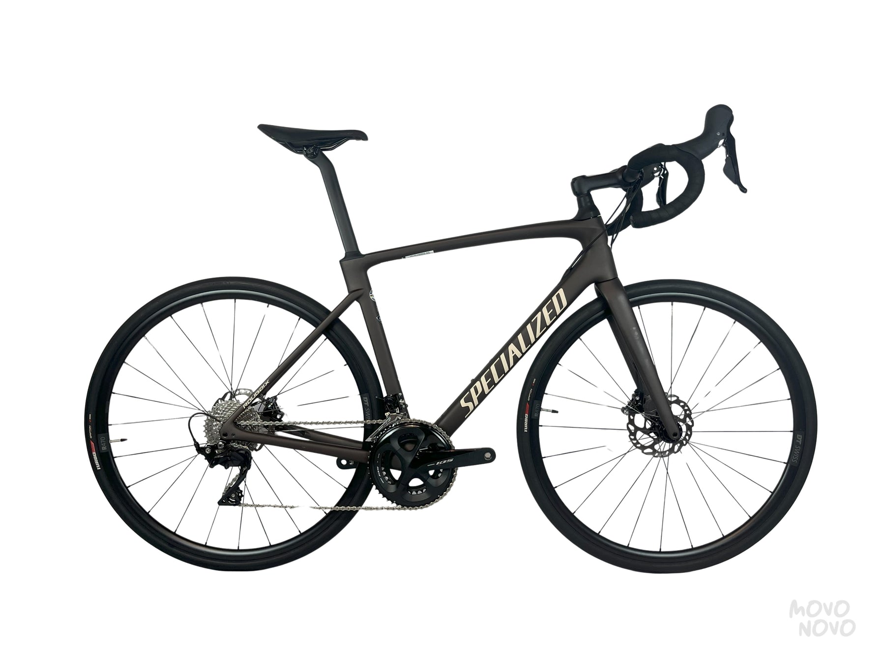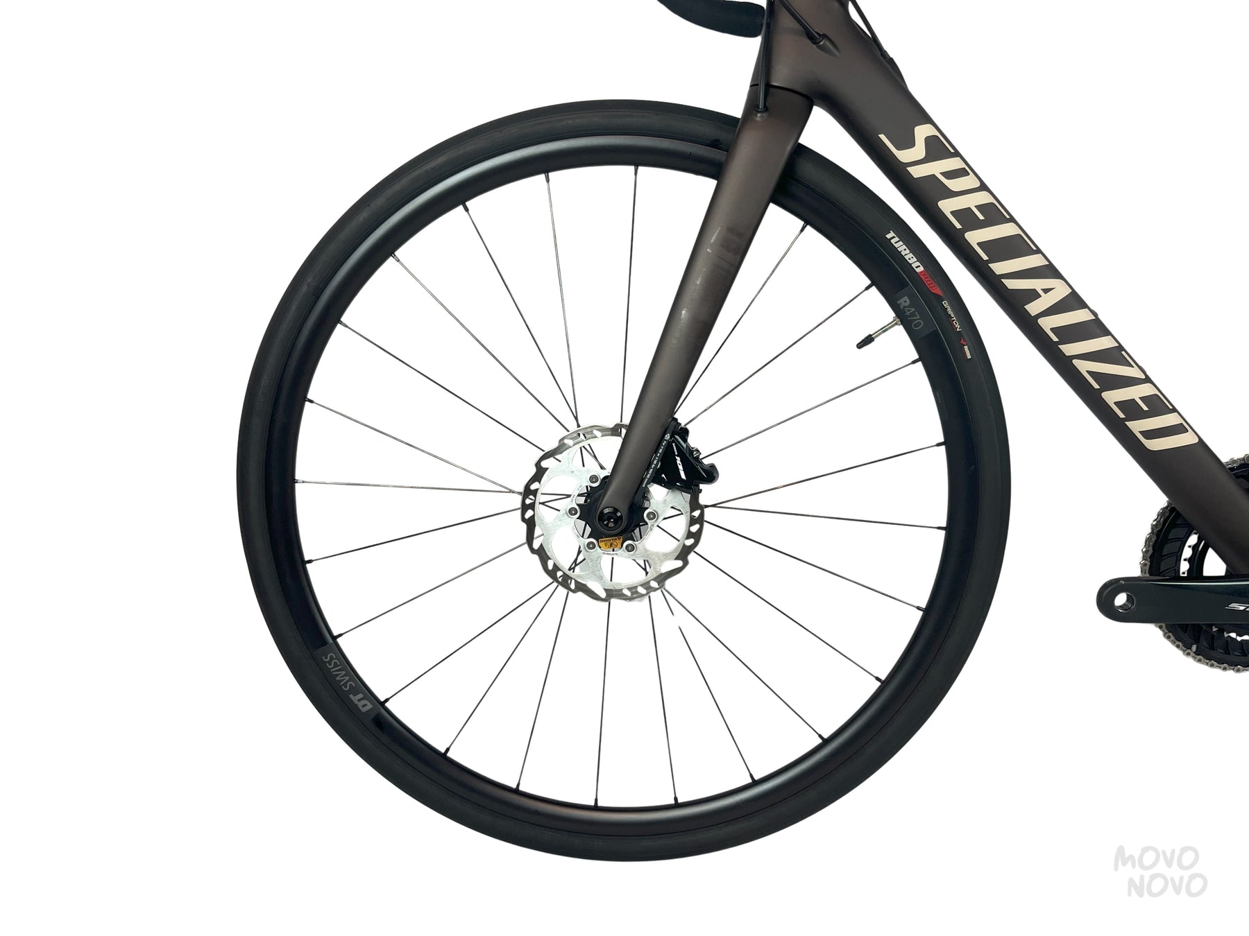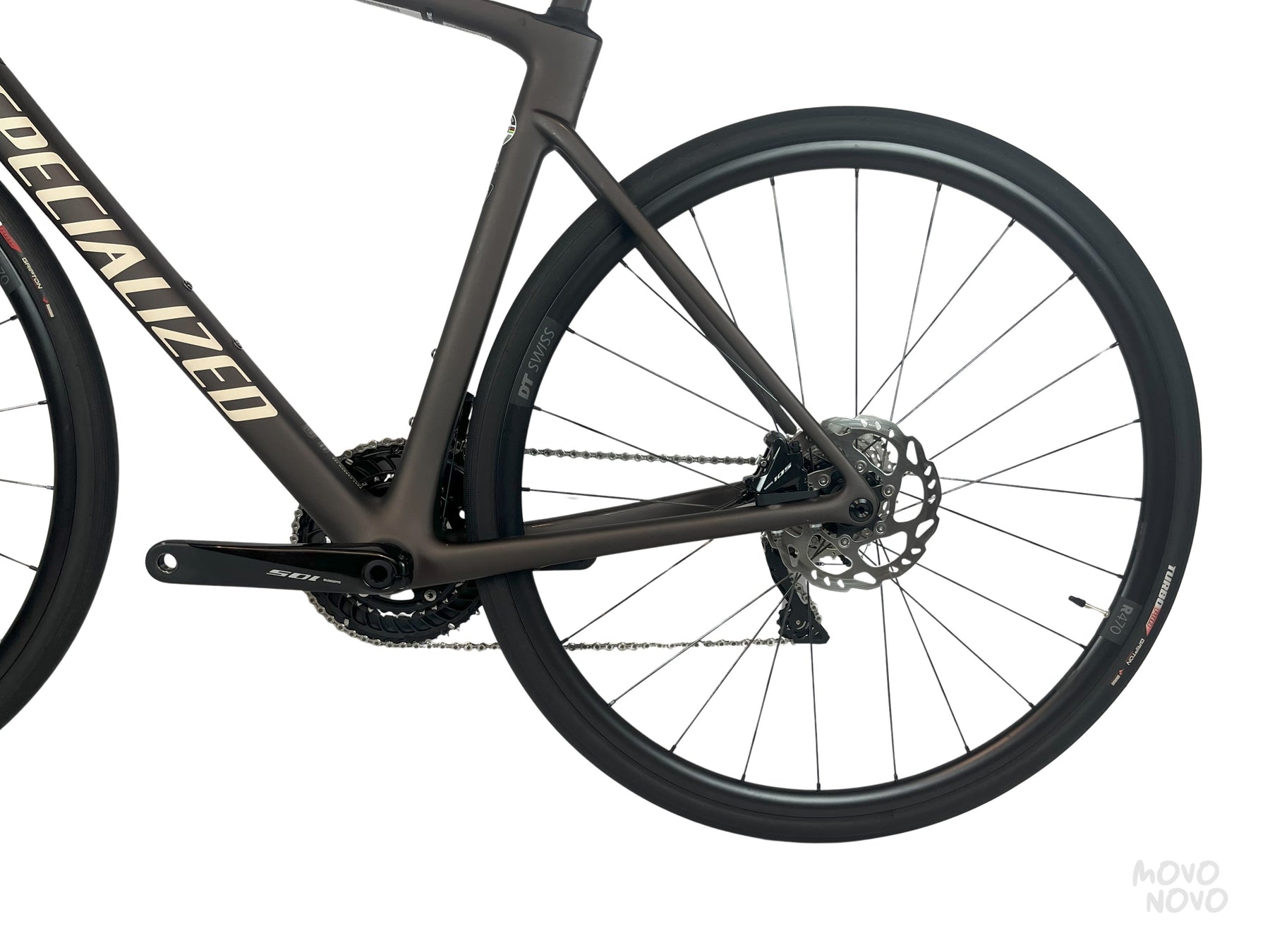 La bicicletab está equipada con una transmisión Shimano 105, rines DTSwiss R470
