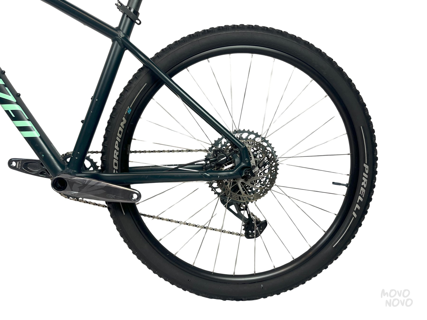 La bicicleta está equipada con transmision SRAM Gx 1x12, frenos hidraulicos Tektro y suspensión XCM SR Suntour