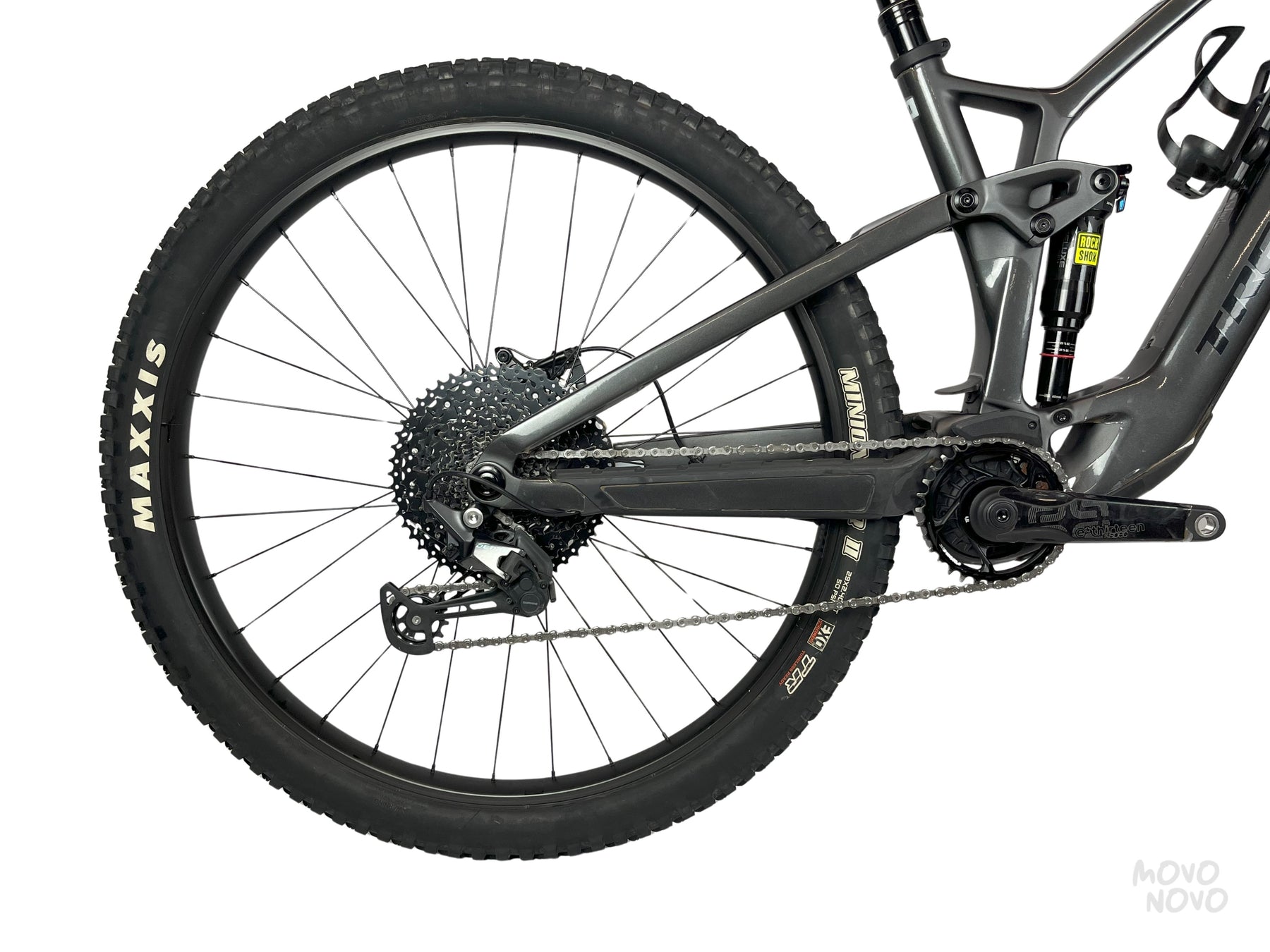 La bicicleta está equipada con transmisión Shimano Deore 1x12, frenos Shimano MT4100, suspensiones Rockshox 35 y Deluxe Select+