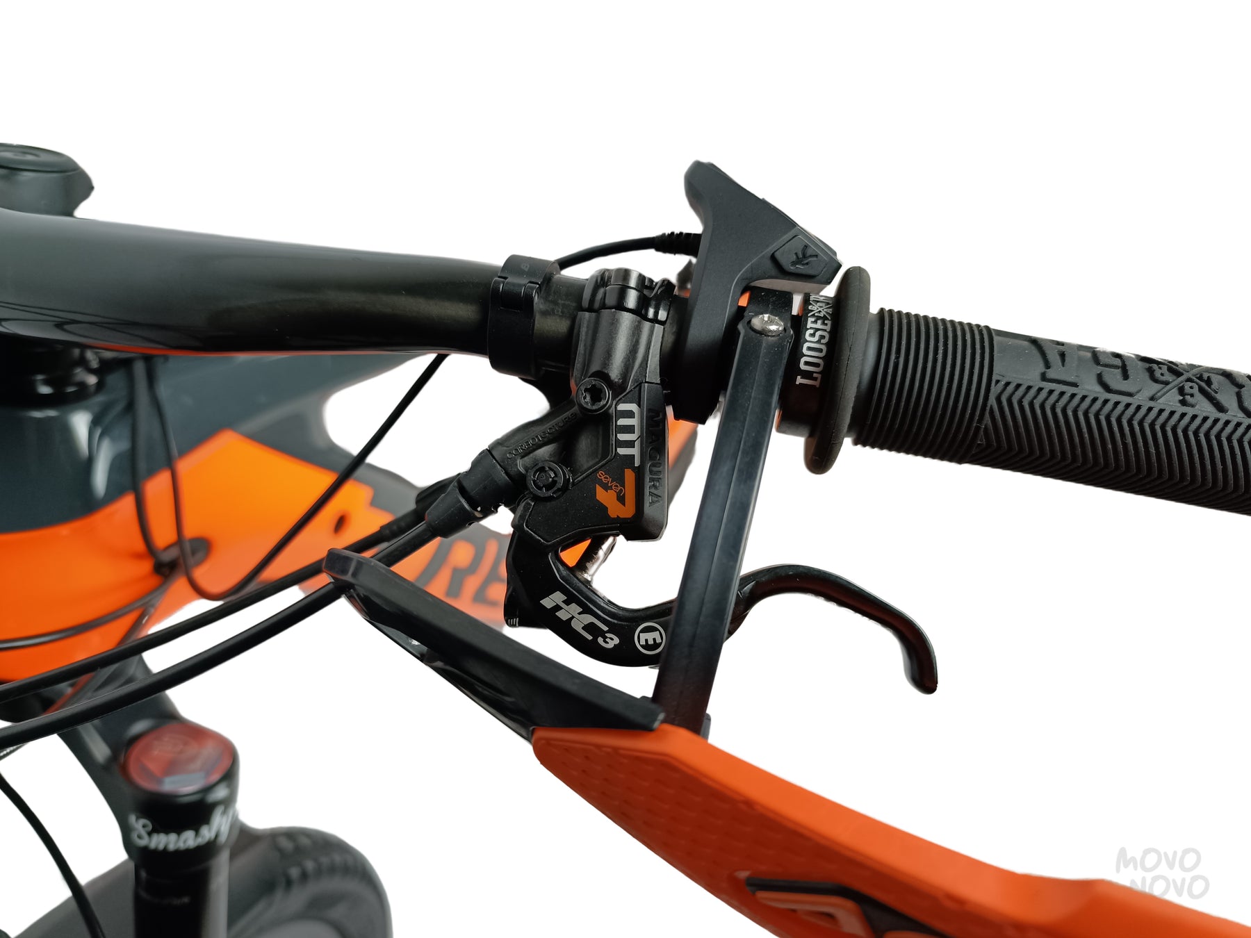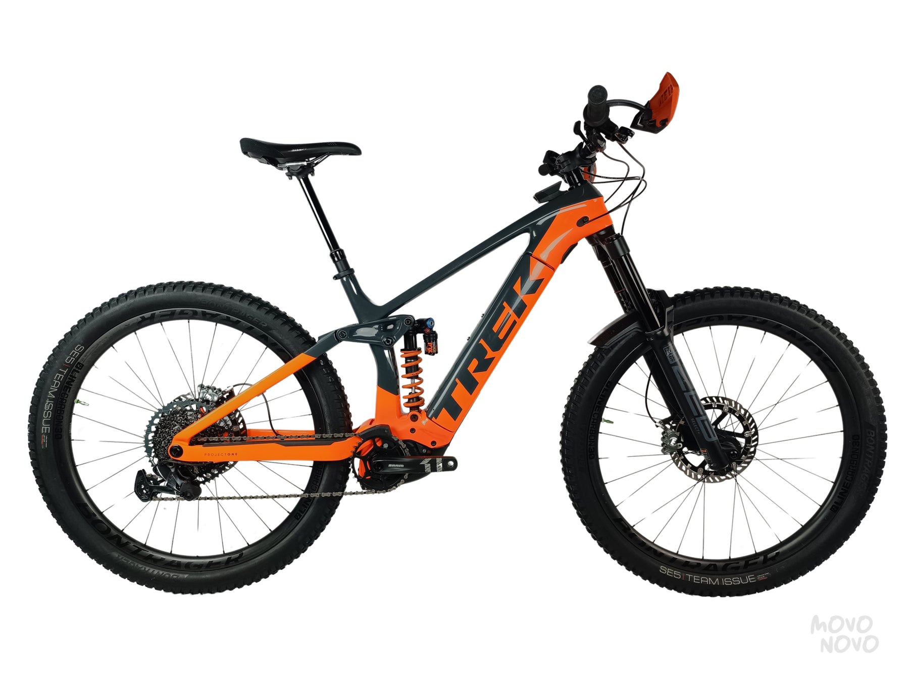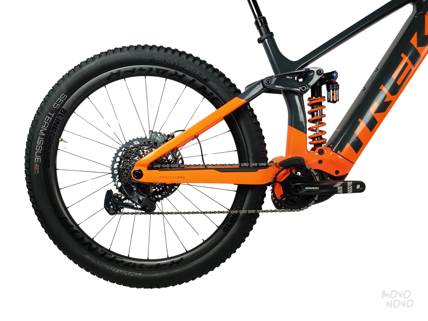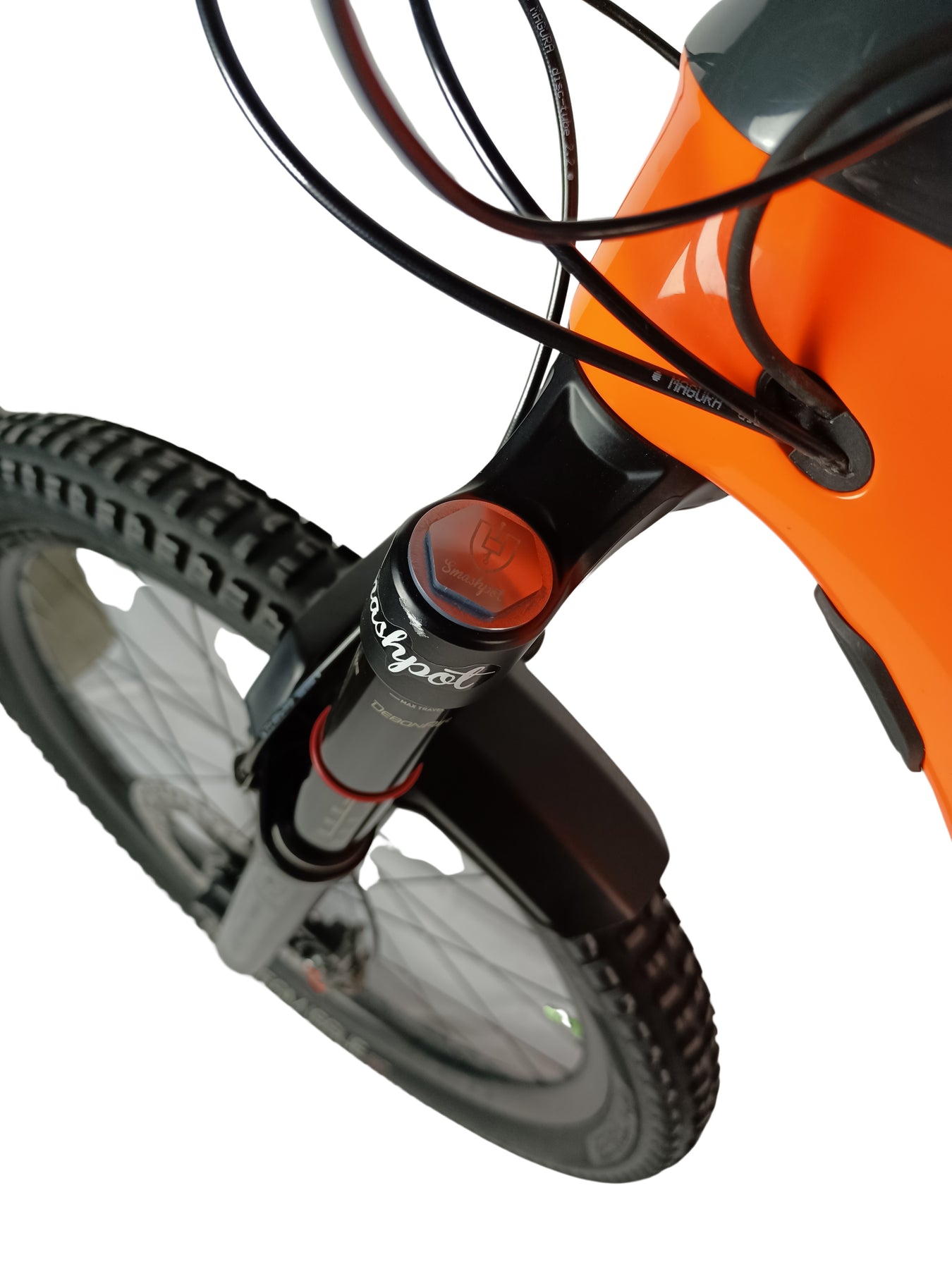 Una bicicleta de e-bike enduro talla L. El cuadro es de carbón. Pesa 20 kg. Tiene componentes Sram . Después de una detallada revisión, su calificación es de 8.96.