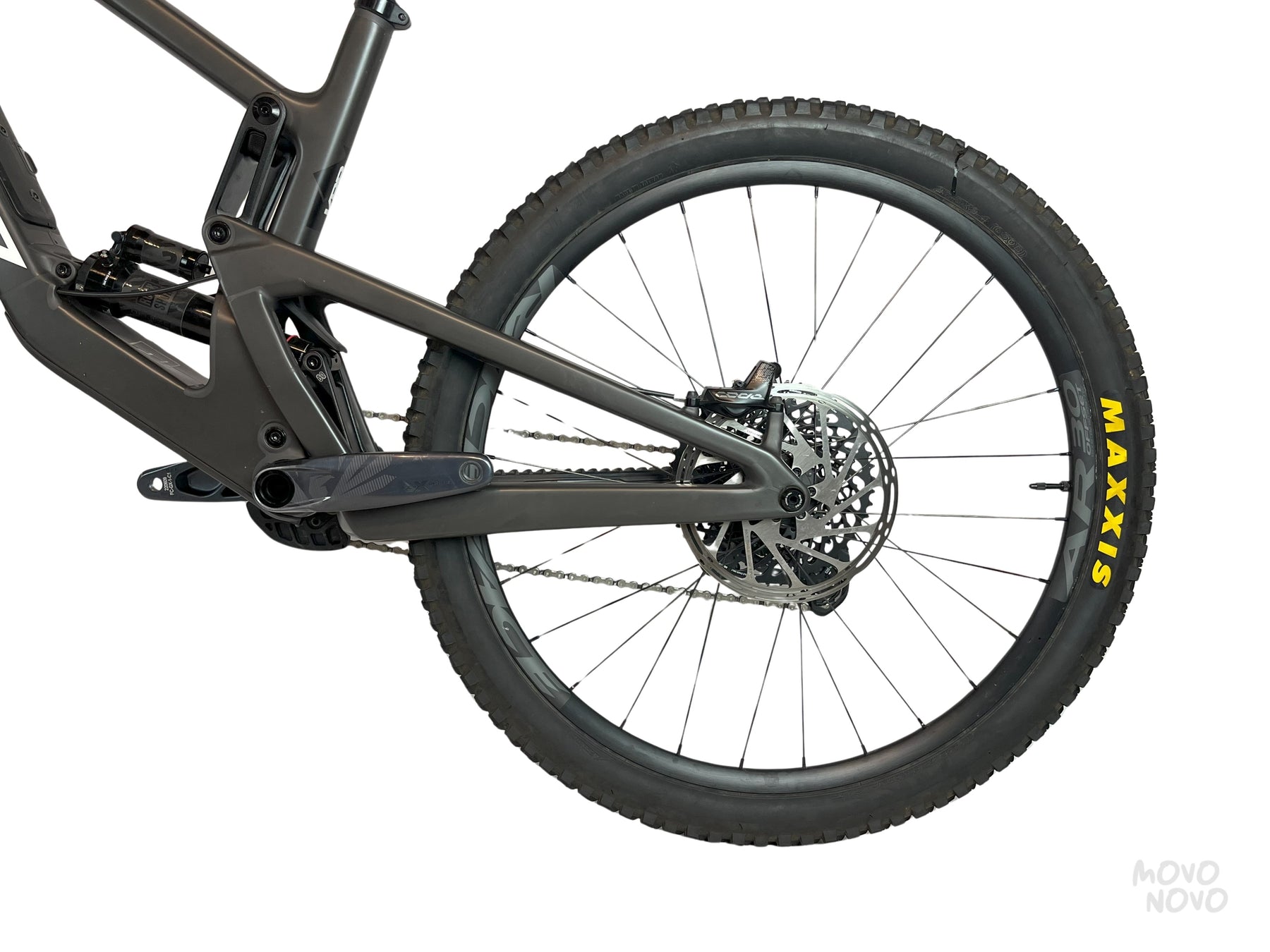 La bicicleta esta equipada con una transmisión SRAM GX 1x12, Suspension Fox 38 Performance, RockShox Super Deluxe Select+