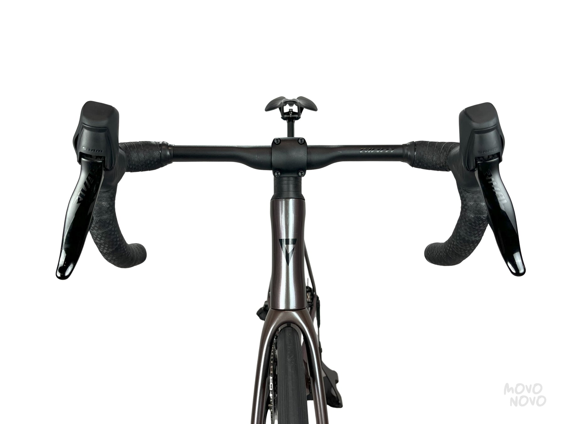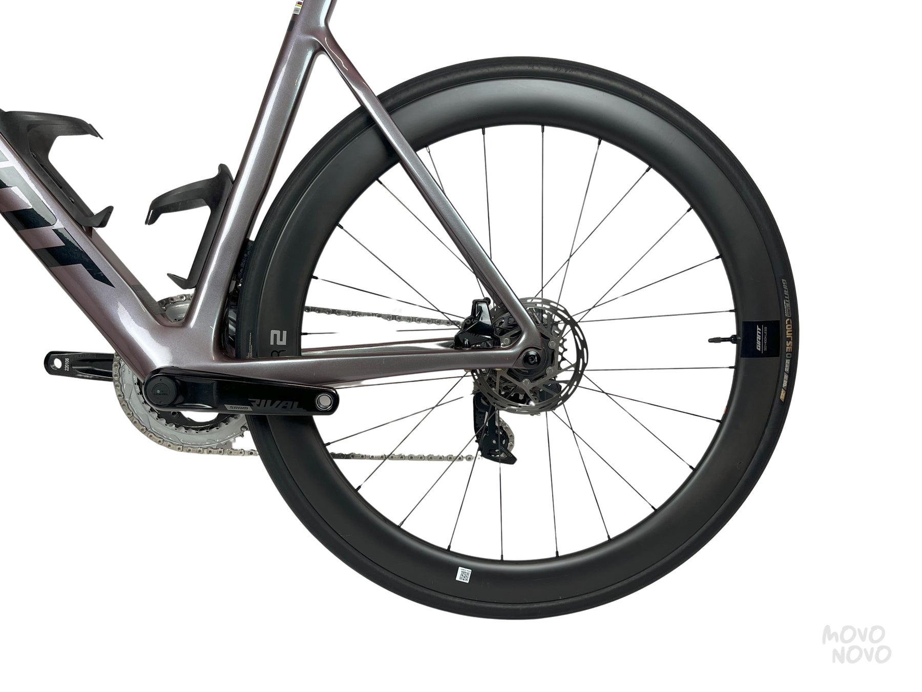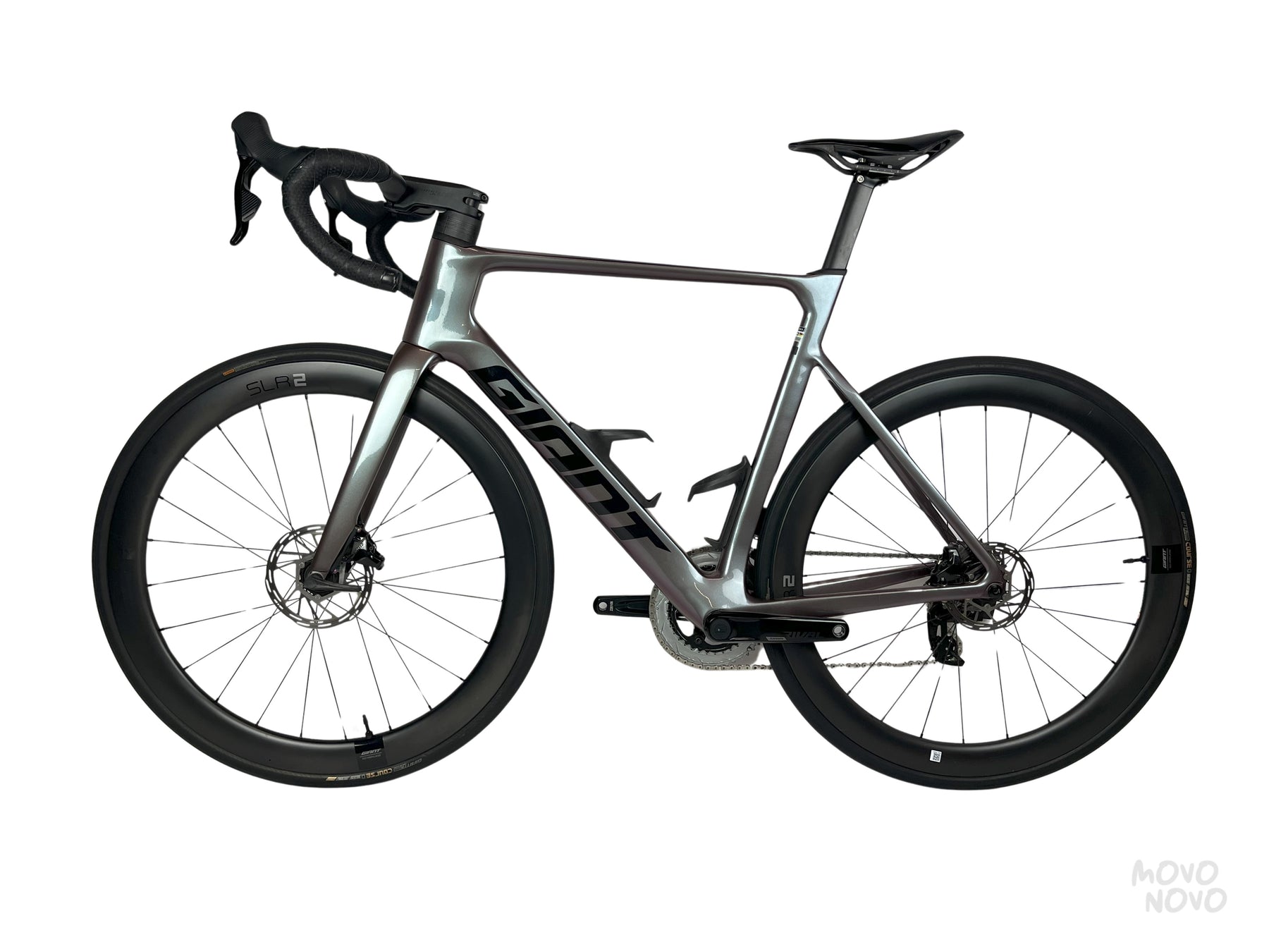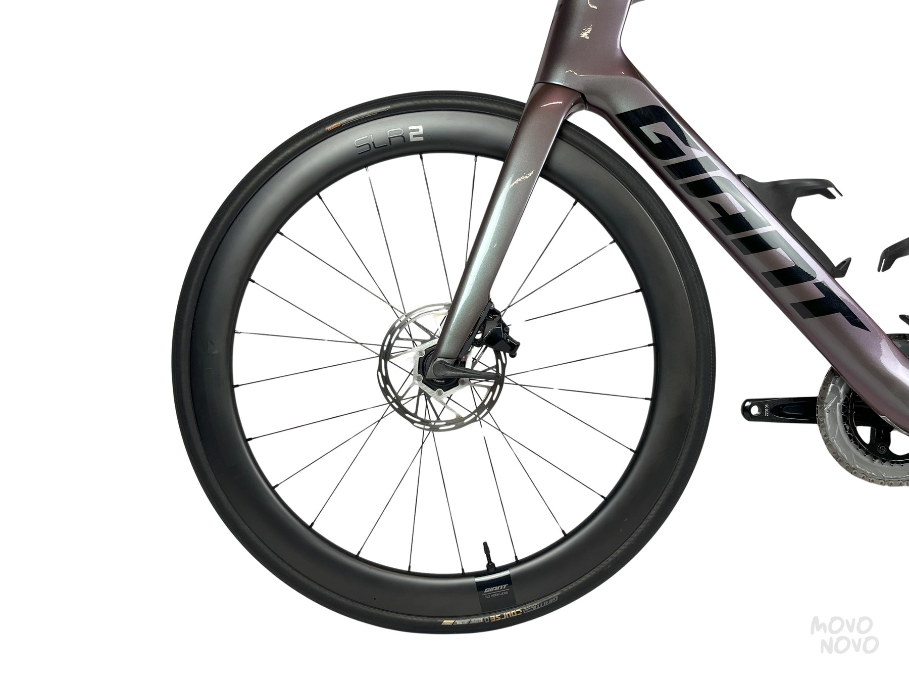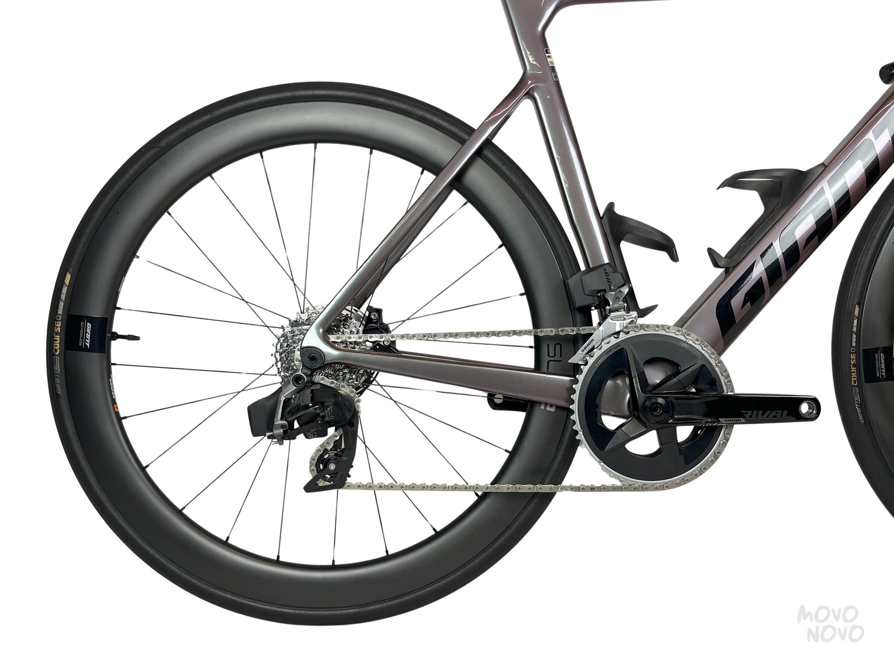 La bicicleta esta equipada con una transmisión SRAM Rival AXS, rines Giant SLR 2 y sillín Cadex de carbono