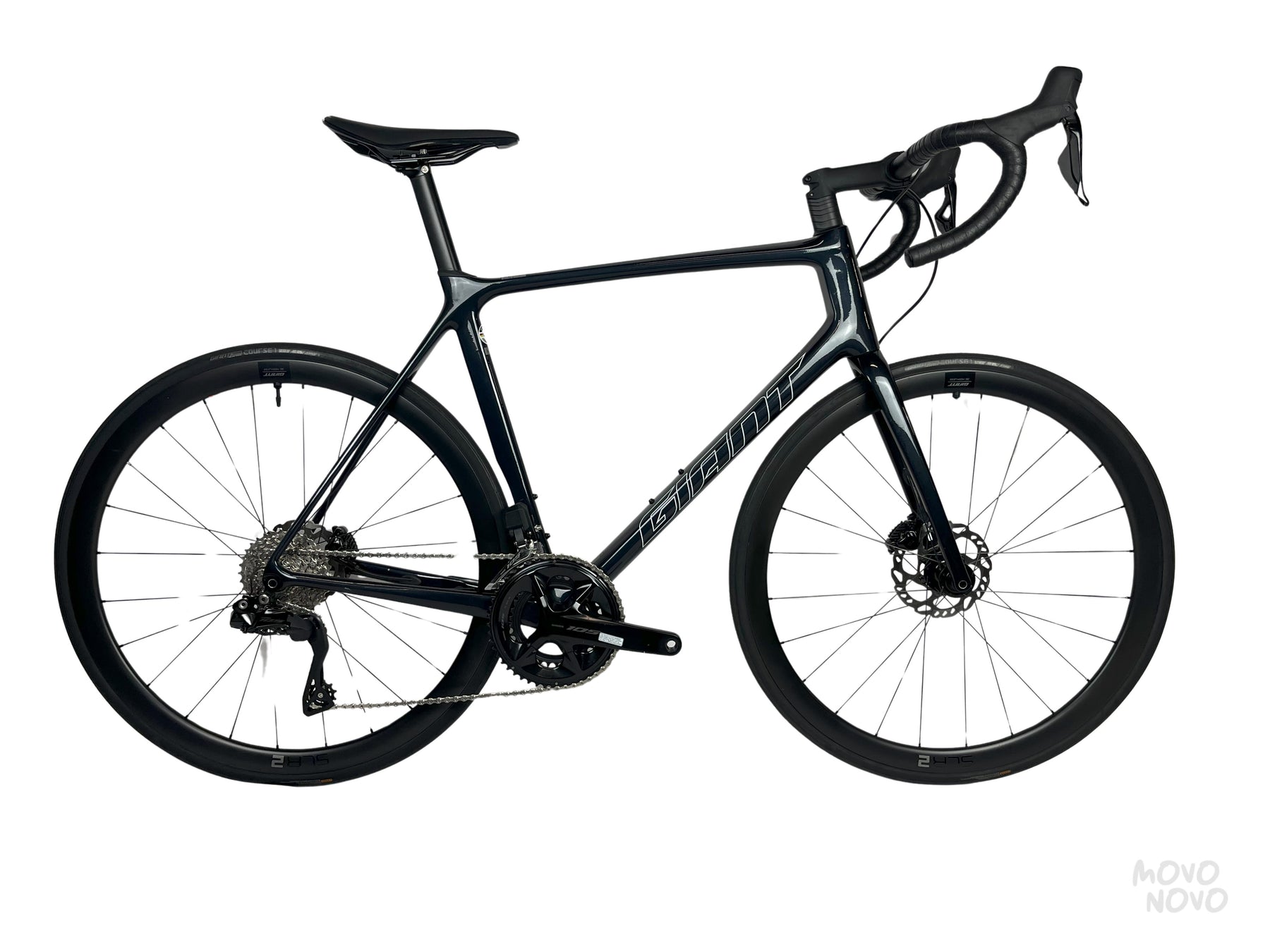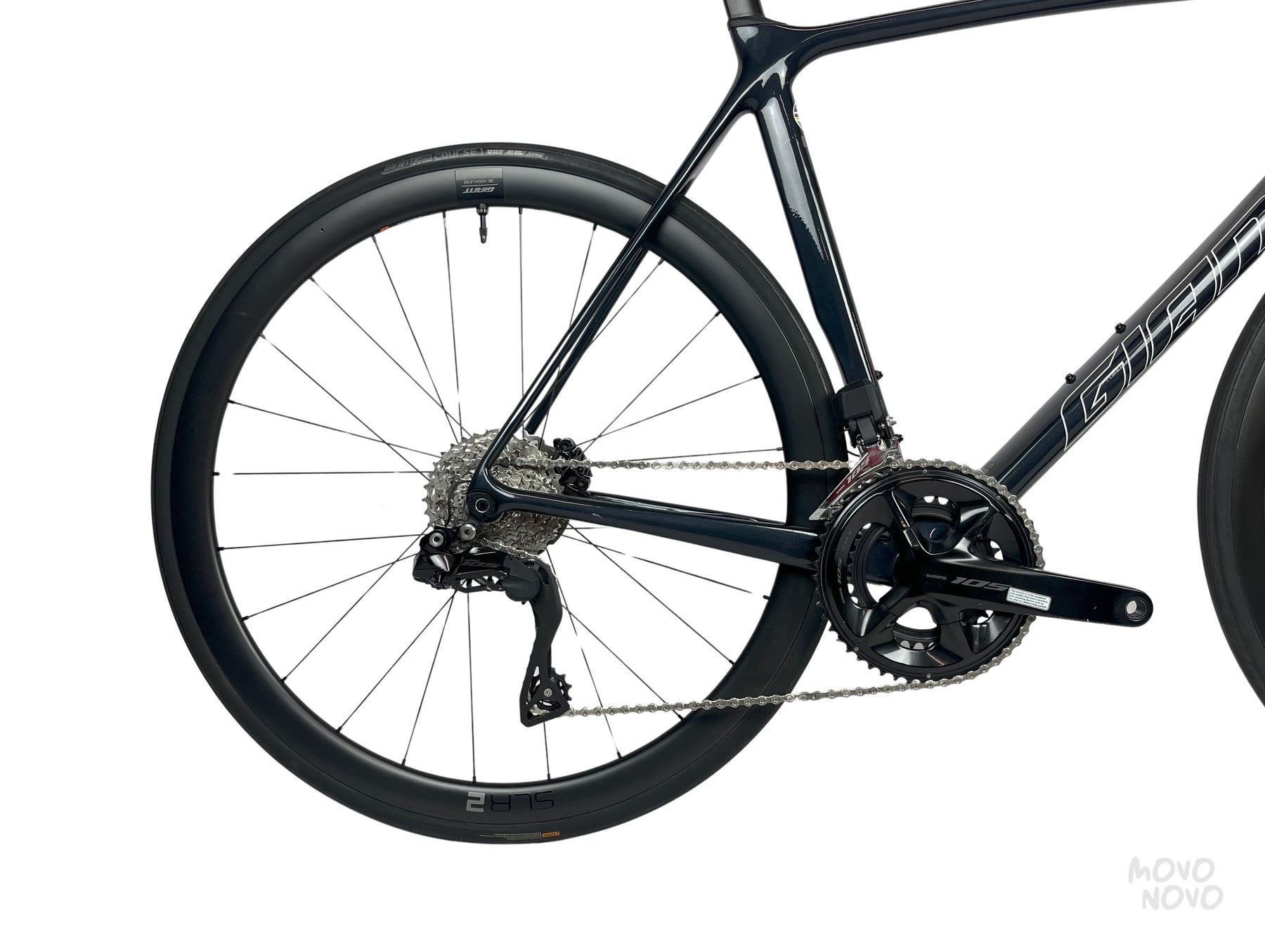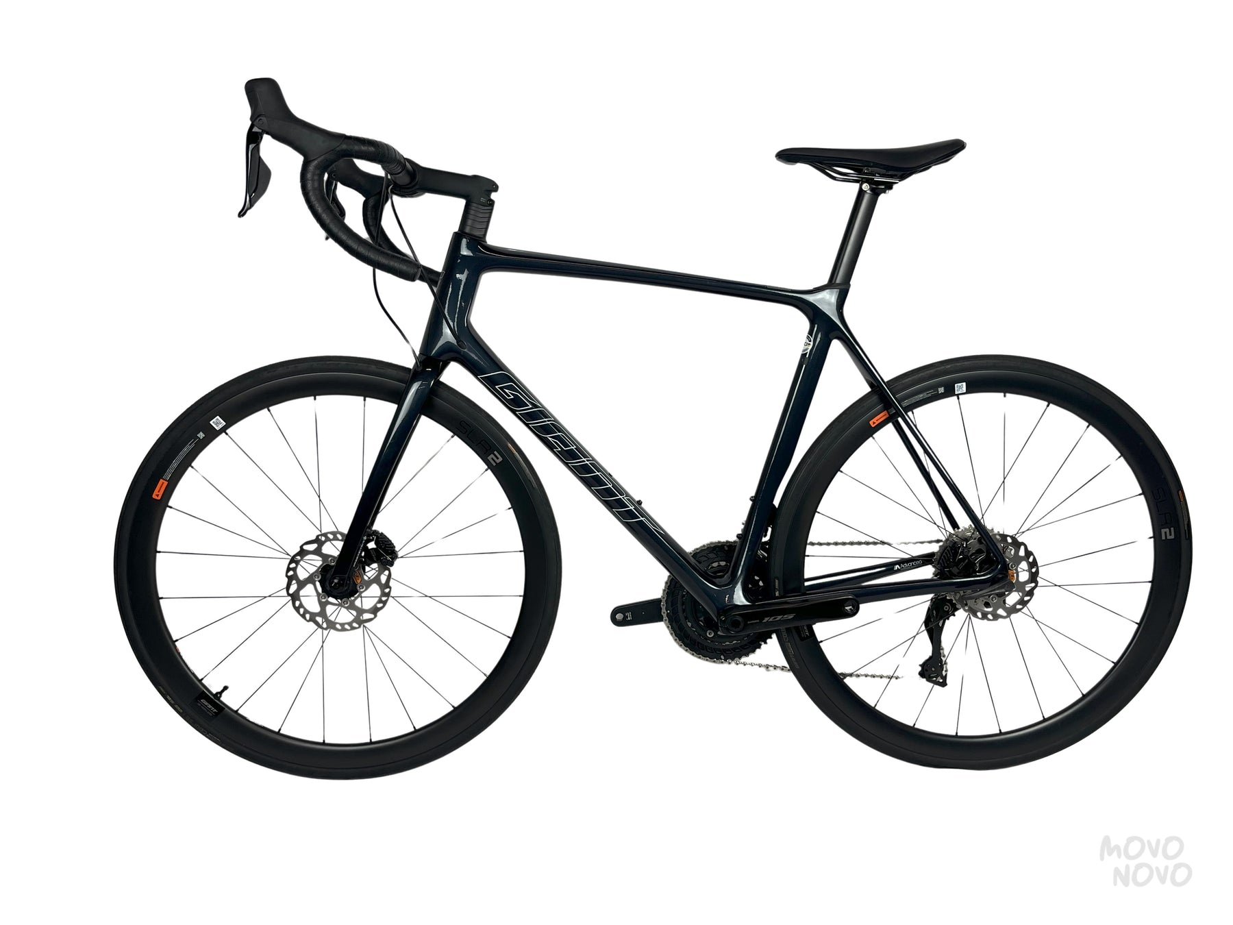 La bicicleta está equipada con una transmisión Shimano 105 Di2 y rines de carbono Giant SLR 2