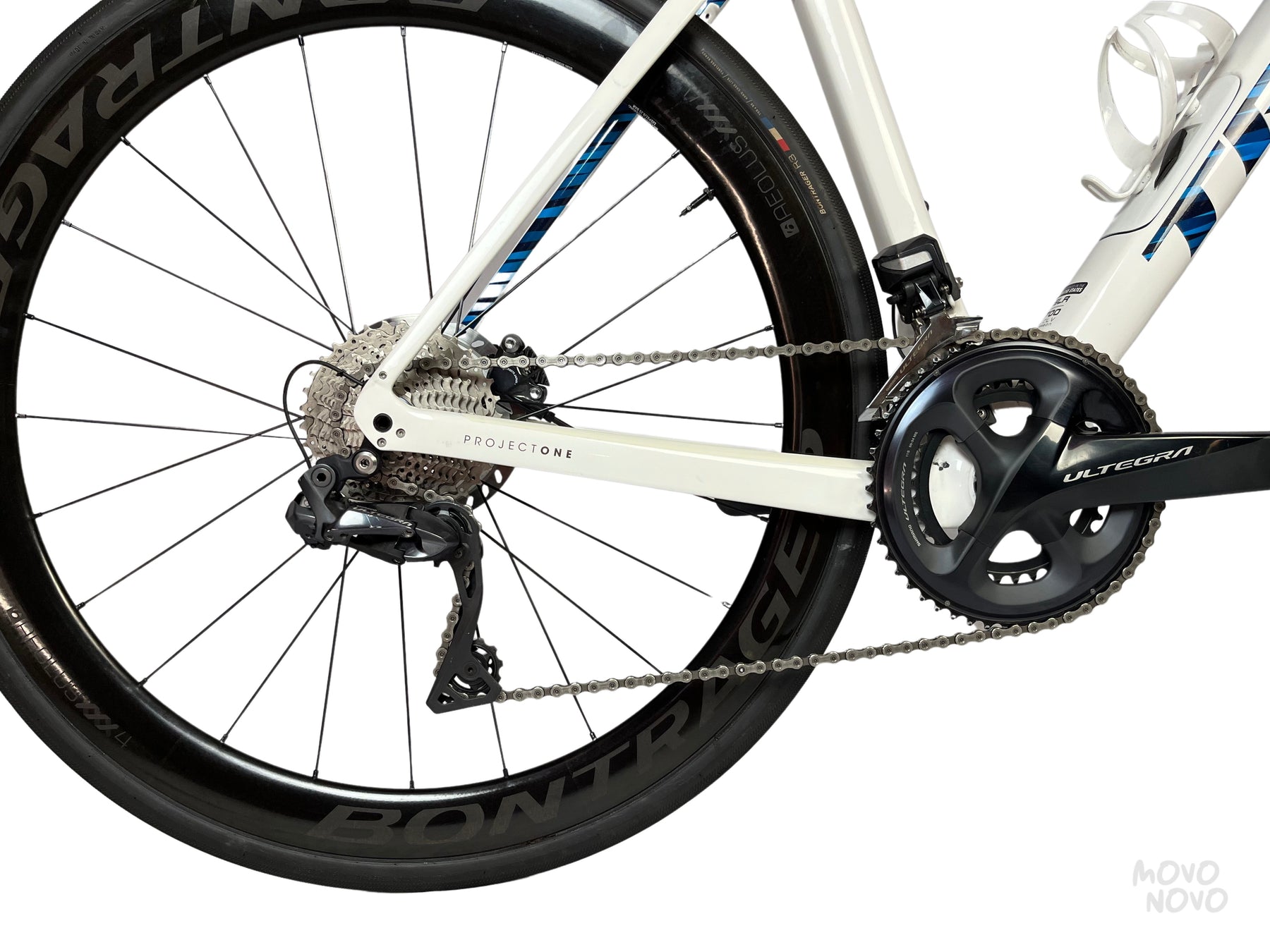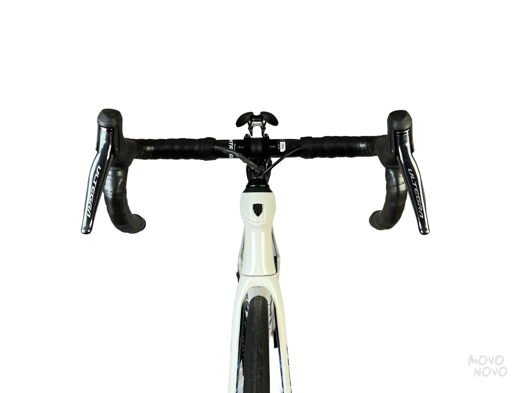 Una bicicleta de ruta talla 54. El cuadro es de carbón. Pesa 7 kg. Tiene componentes Ultegra di2. Después de una detallada revisión, su calificación es de 8.84.