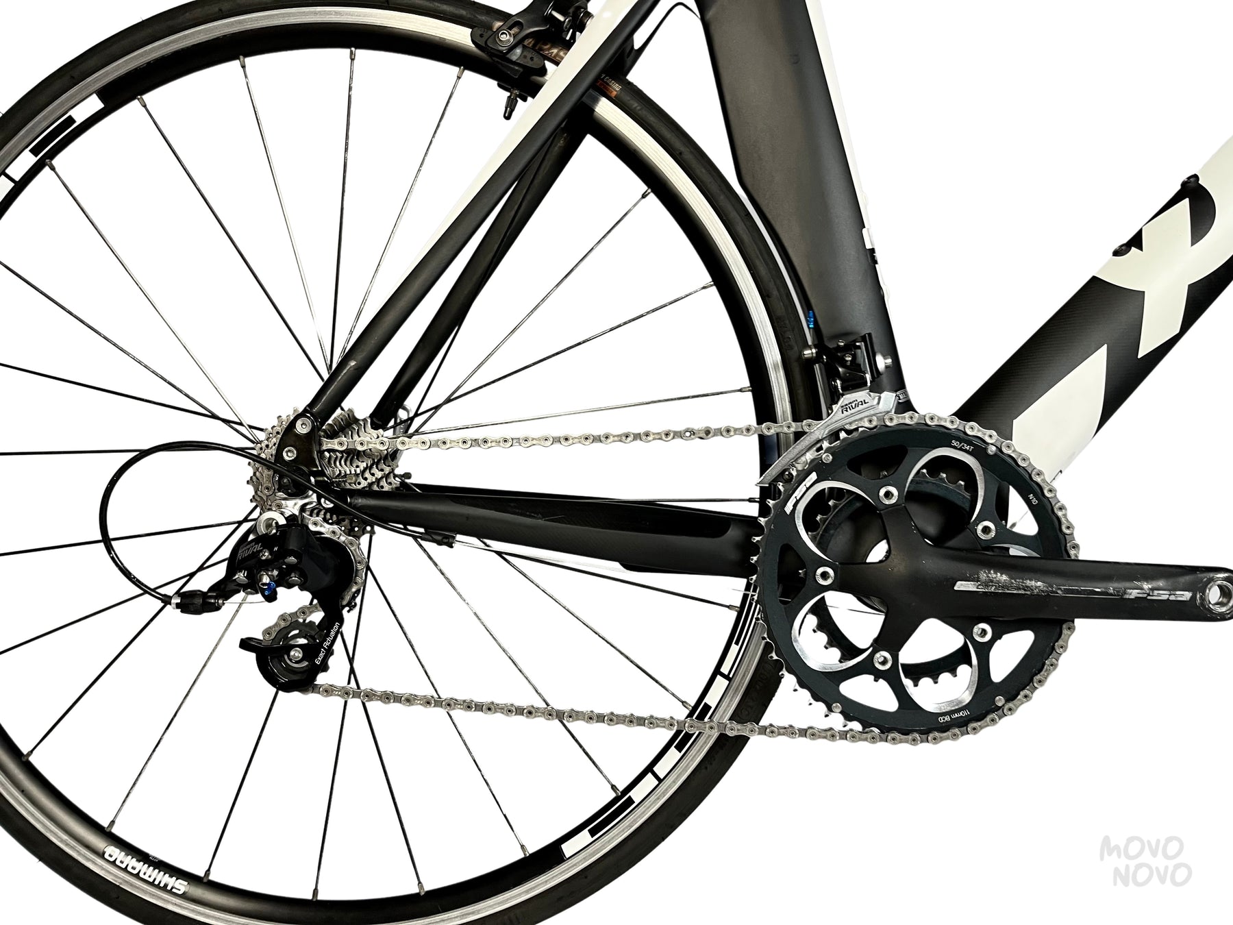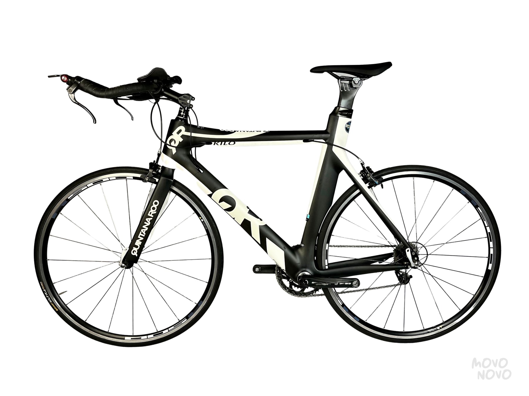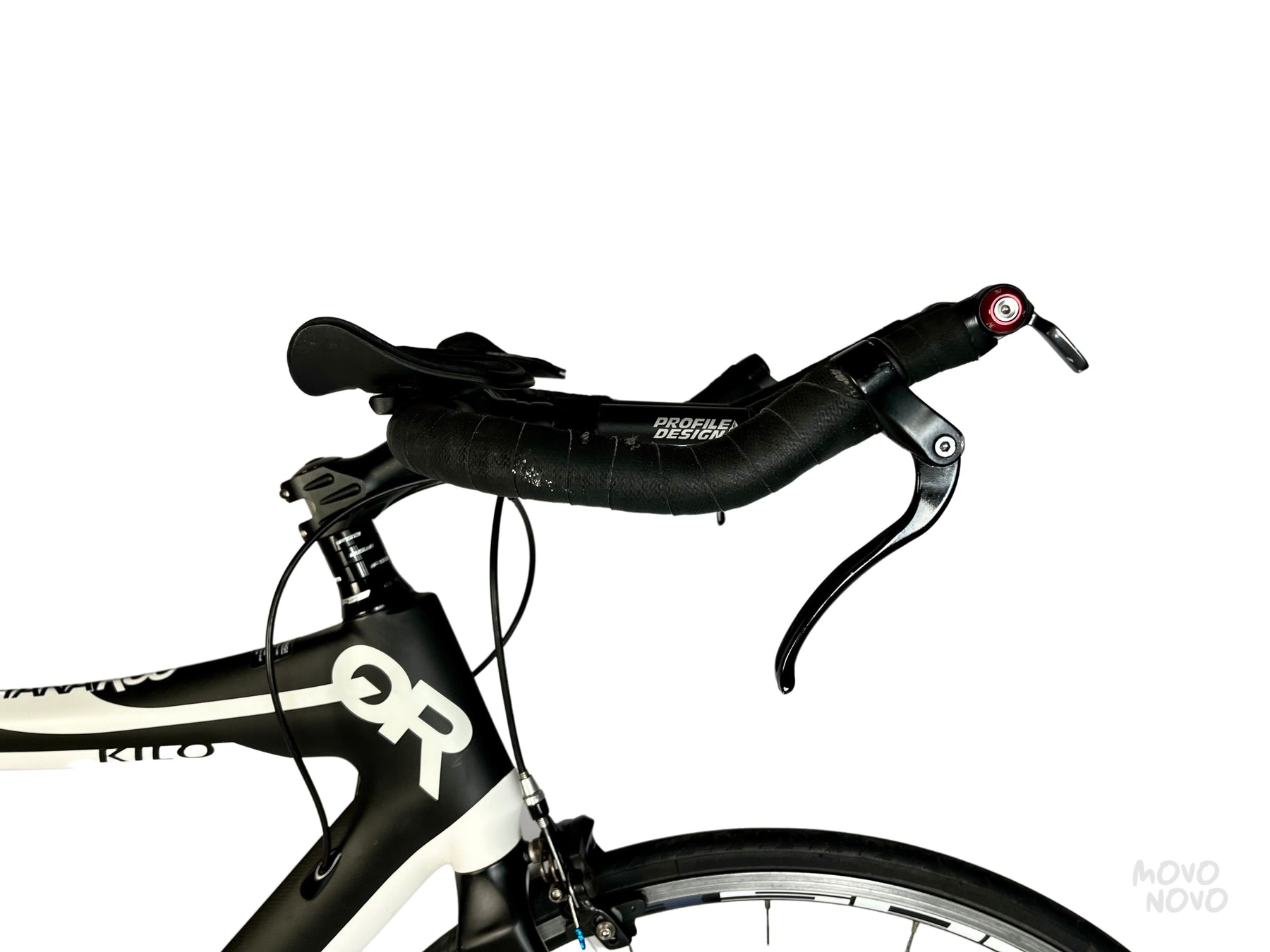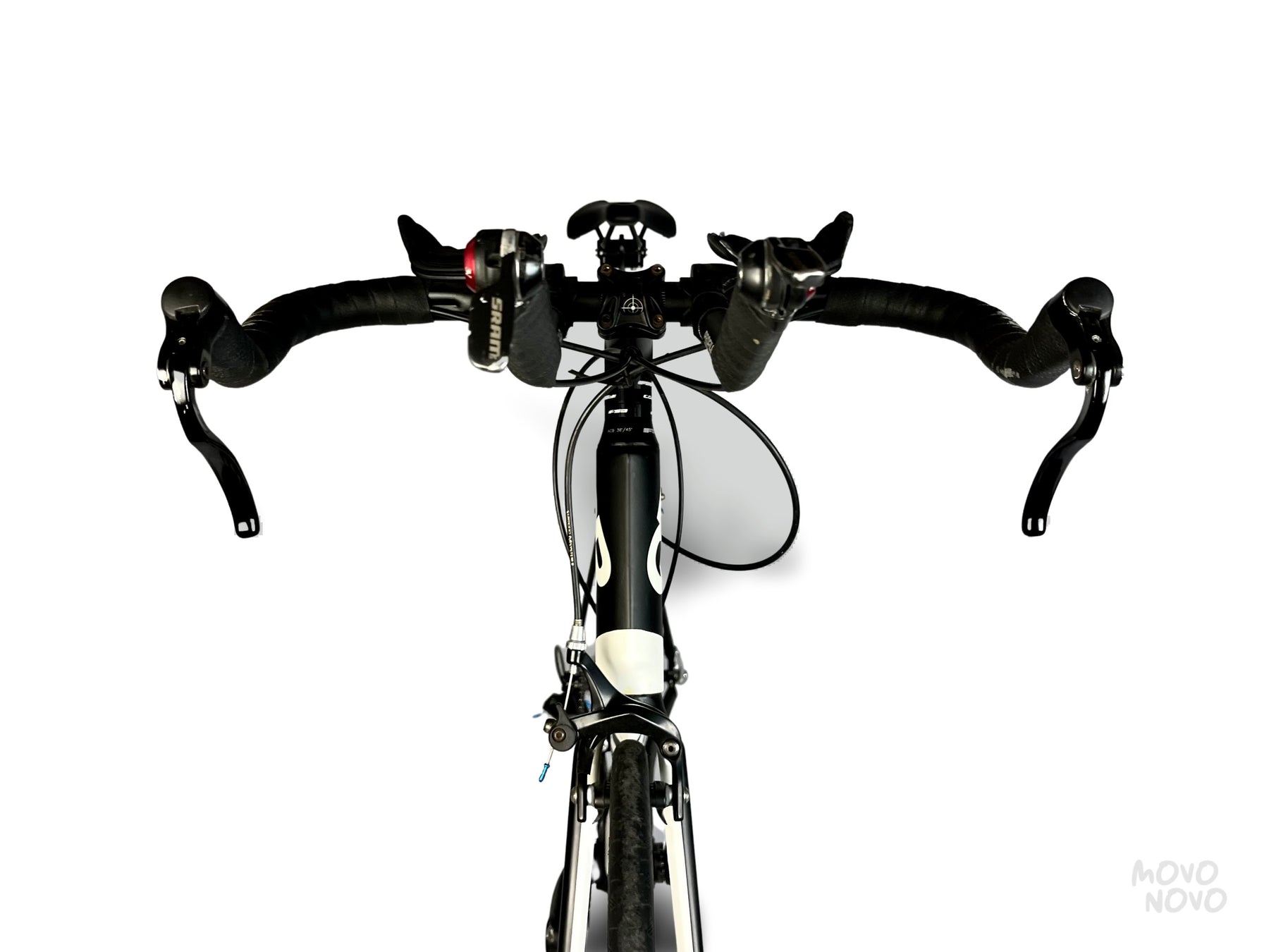 Una bicicleta de triatlón talla L. El cuadro es de carbón. Pesa 9 kg. Tiene componentes Sram. Después de una detallada revisión, su calificación es de 8.94.