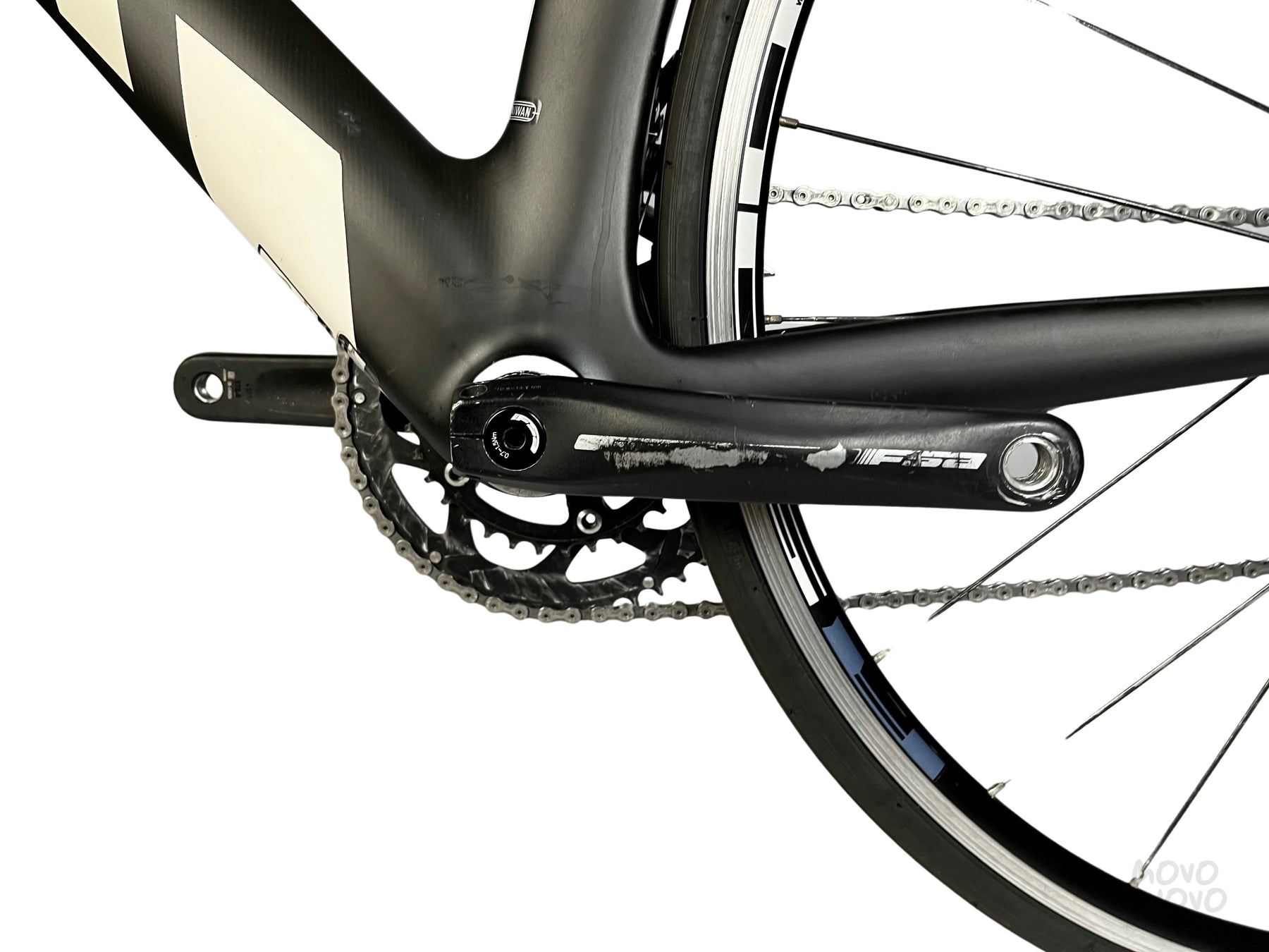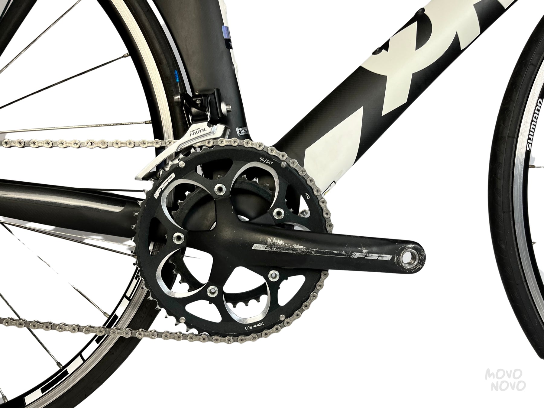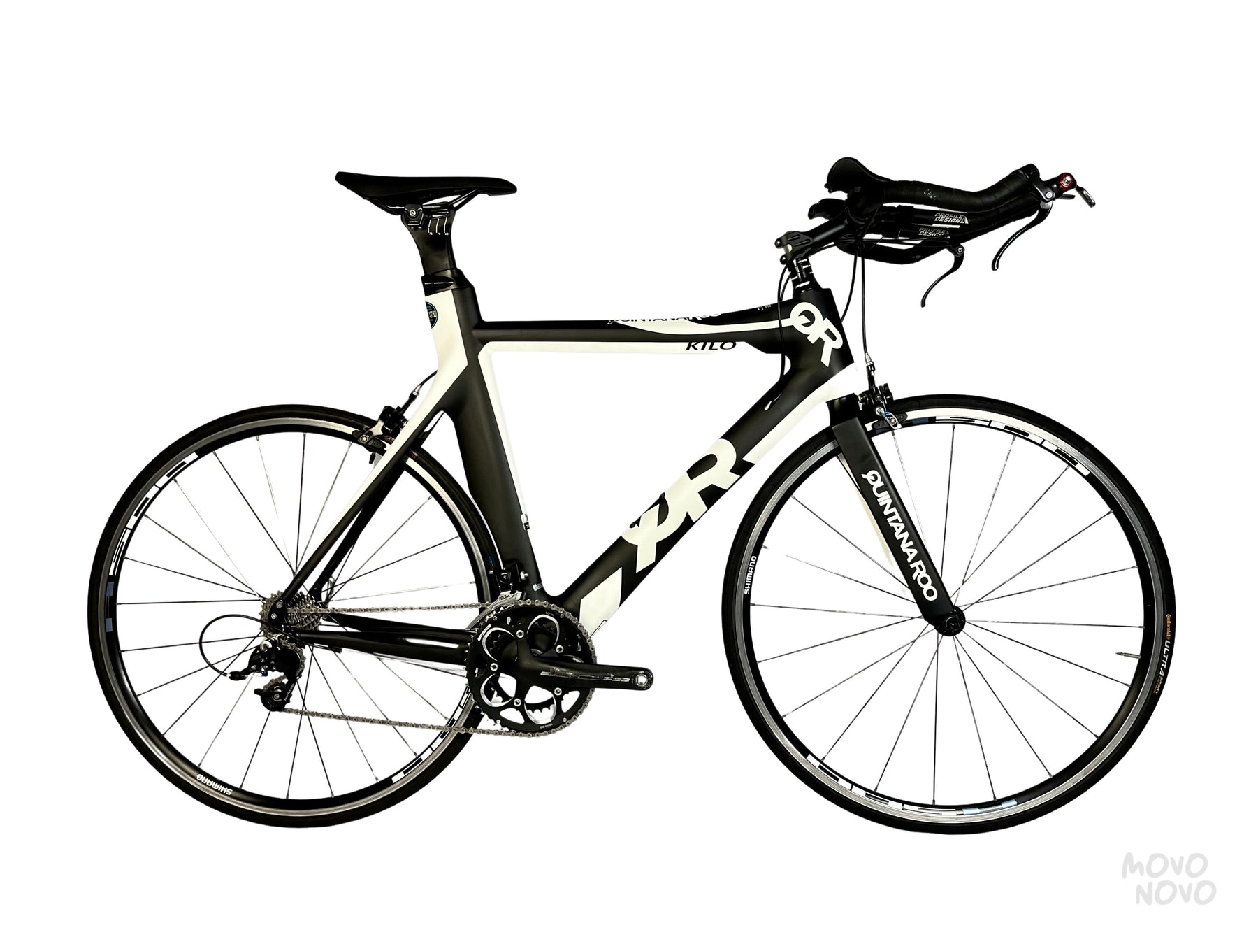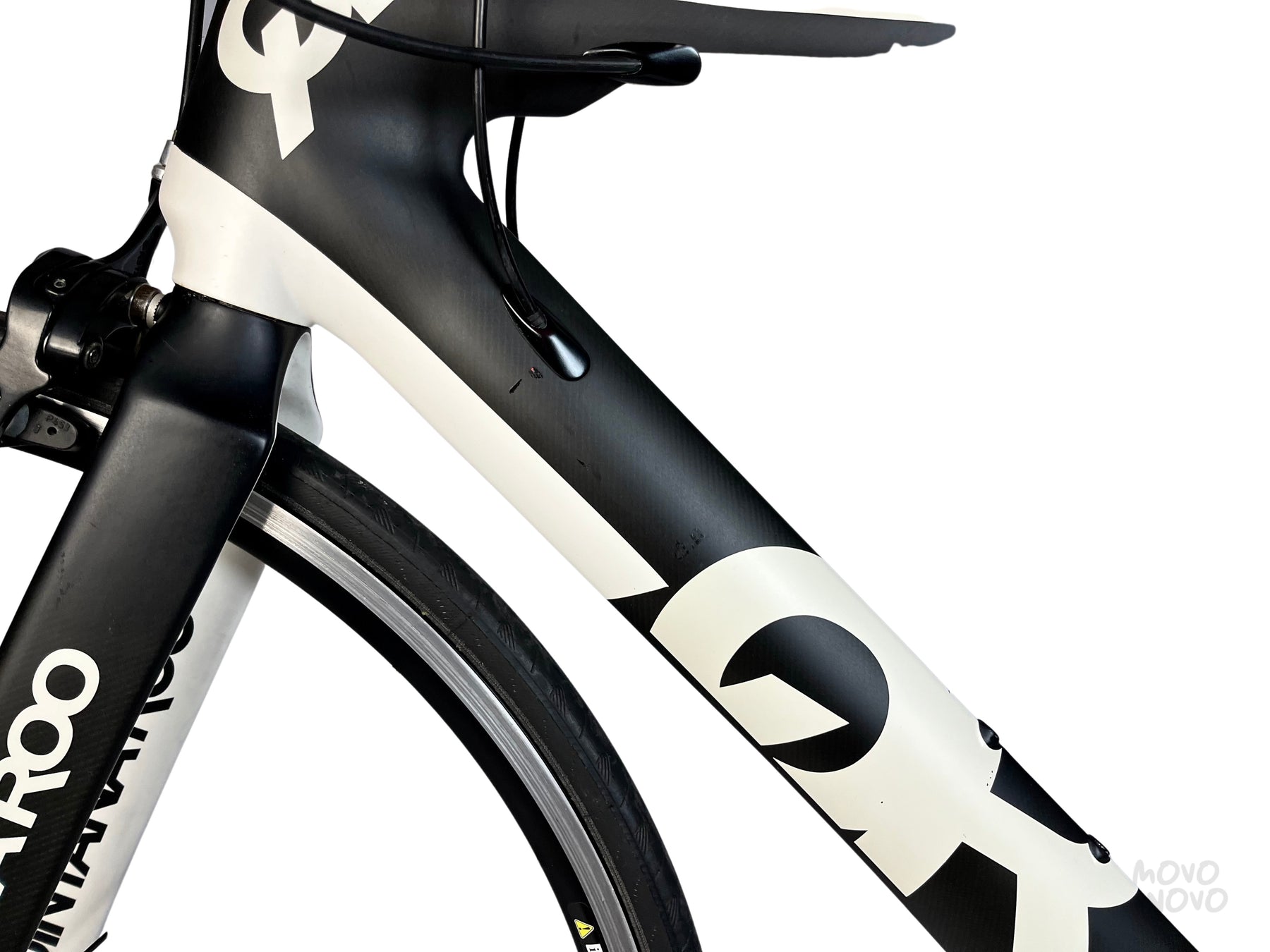 Una bicicleta de triatlón talla L. El cuadro es de carbón. Pesa 9 kg. Tiene componentes Sram. Después de una detallada revisión, su calificación es de 8.94.
